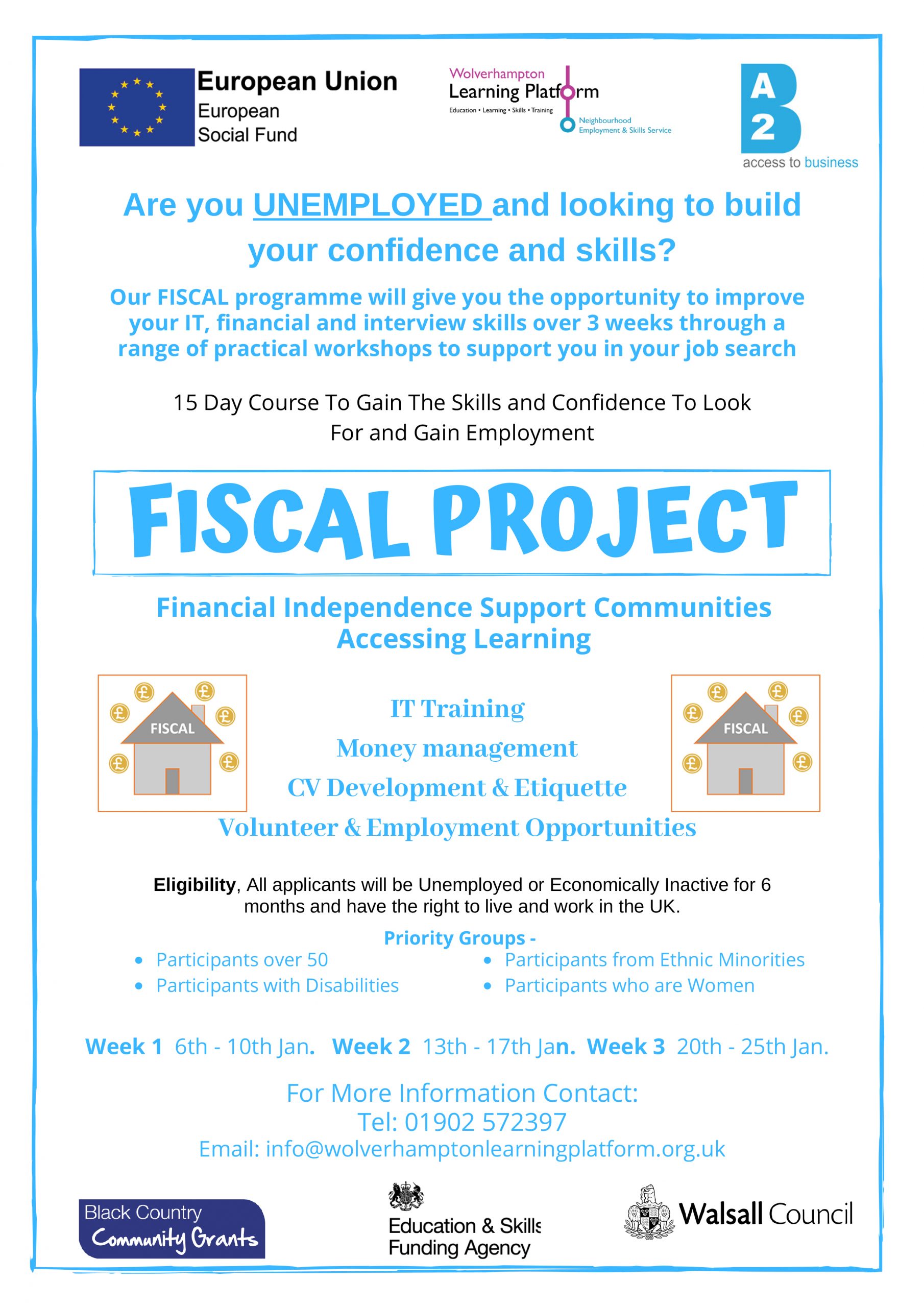 Wolverhampton Learning Platform CIC partners, Access to Business, Bilston Resource Centre, Job Change, TLC College and YMCA Wolverhampton are delivering a new and exciting FISCAL project (August 2019- January 2020), funded by the Black Country ESF Community Grant.